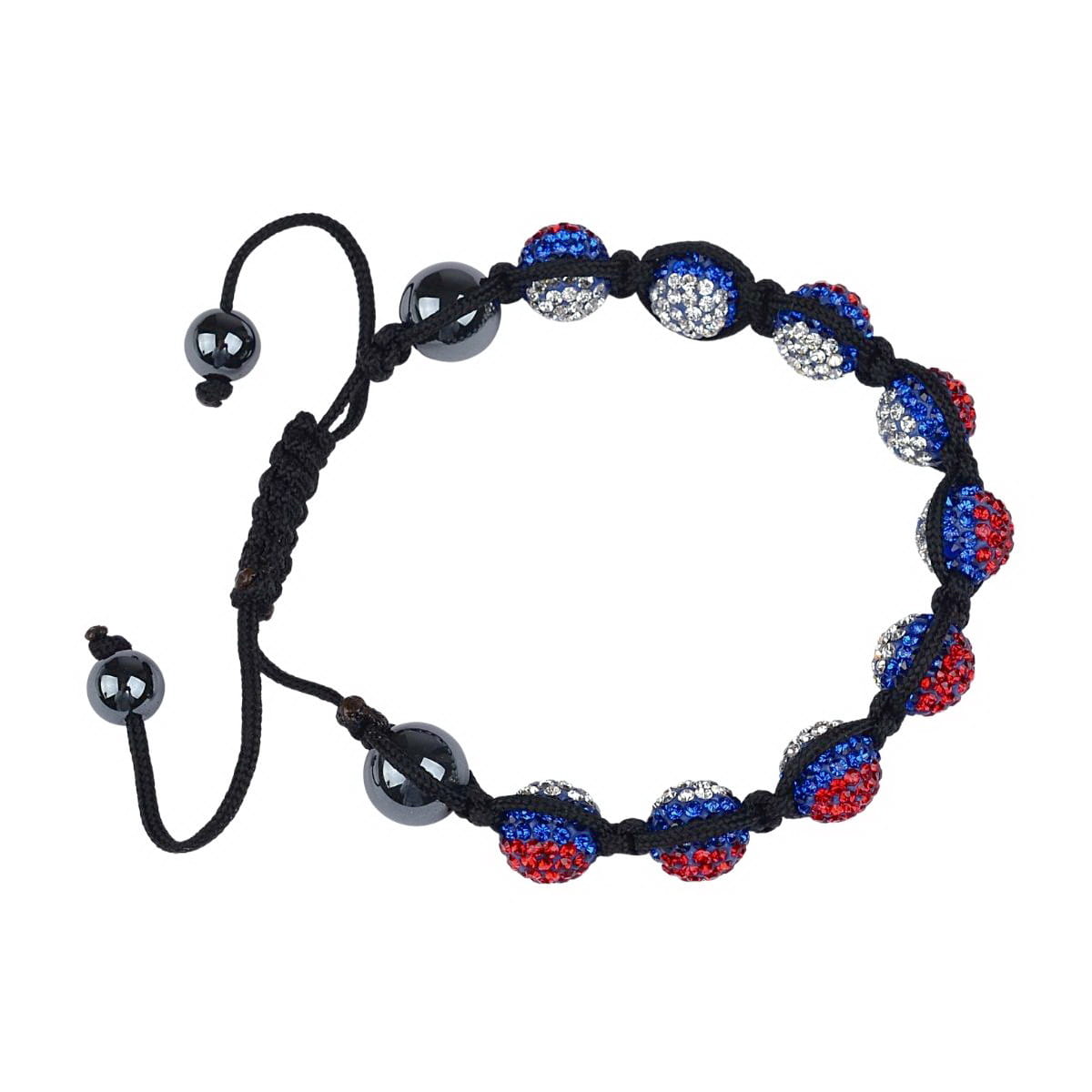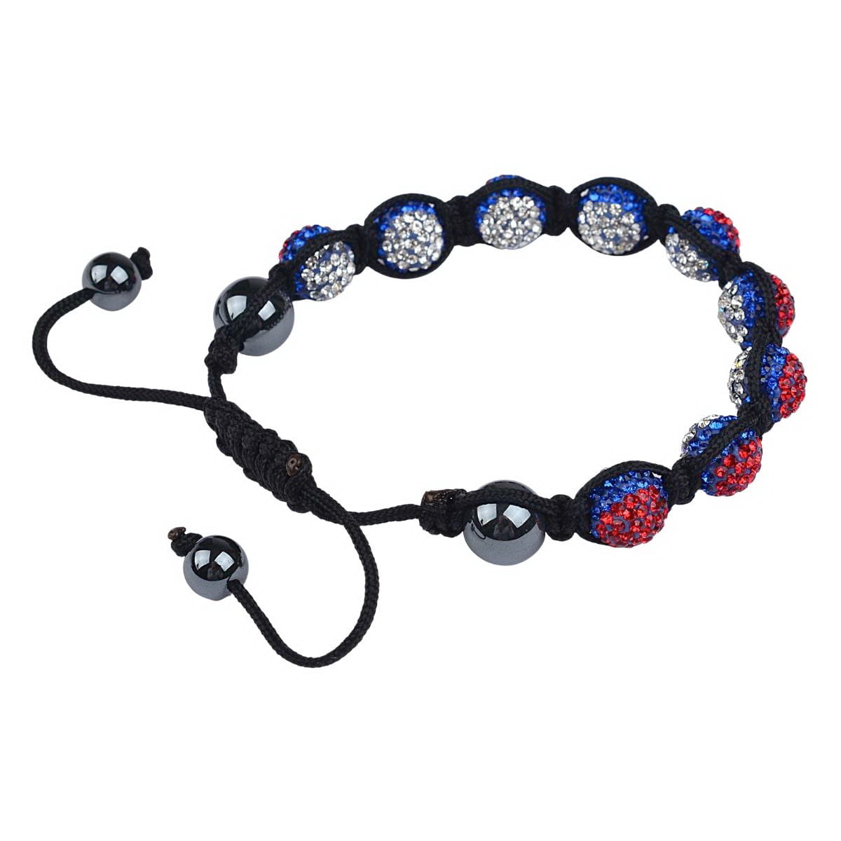 Bransoletka shamballa pleciona z koralikami discoball i hematytem. Bransoletka wykonana technika wyplatania, zawiera koraliki 10mm wysadzane cyrkoniami w 3 kolorach oraz kamienie hematyt. Na końcach bransoletka posiada wypuszczone dwa sznureczki zakończone koralikami, które służą do regulacji obwodu. Można regulować obwód w zakresie 17cm do 25cm.