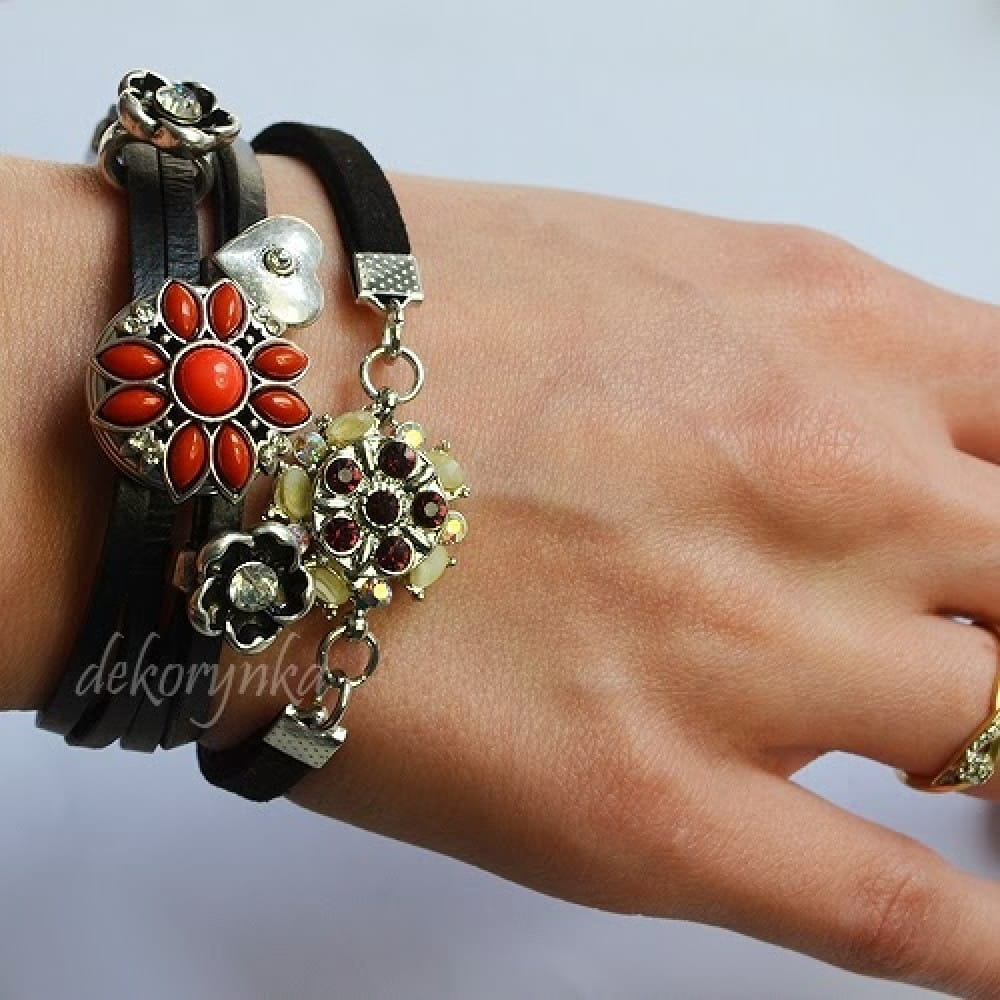 Baza do bransoletki wykonana z rzemienia zamszowego z metalowymi wstawkami. Zdobiona kamyczkami i cyrkoniami CRYSTAL AB. Posiada miejsce na przypinkę do biżuterii typu CLIK "NAPPA" o średnicy 12mm. Zapinana na karabinek. Bardzo ładnie wykonana. Długość bransoletki 18,5cm + 6cm łańcuszek dystansowy. 1 sztuka.