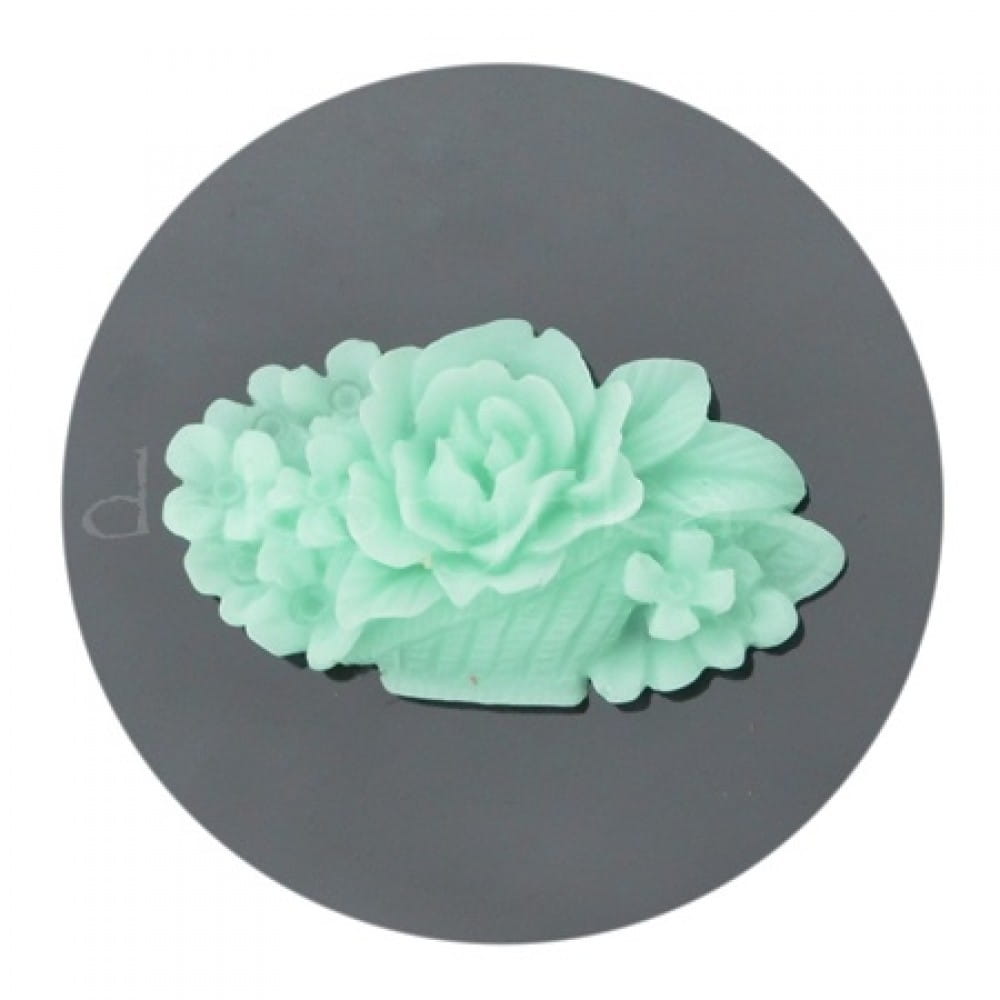 Śliczny kaboszon w kształcie kosza z kwiatami. Wykonany z trwałego akrylu. Idealny do techniki scrapbooking'u, może również zostać zastosowany w florystyce. Posiada płaski spód. Wymiary: 35 x 20 x 7 mm. 1 szuka.