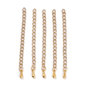 Łańcuszek dystansowy regulacyjny, zakończony ozdobną kropelką. Wykonany ze stali nierdzewnej, powlekanej bardzo trwałą warstwą koloru w technice galwanizacji próżniowej (PVD).