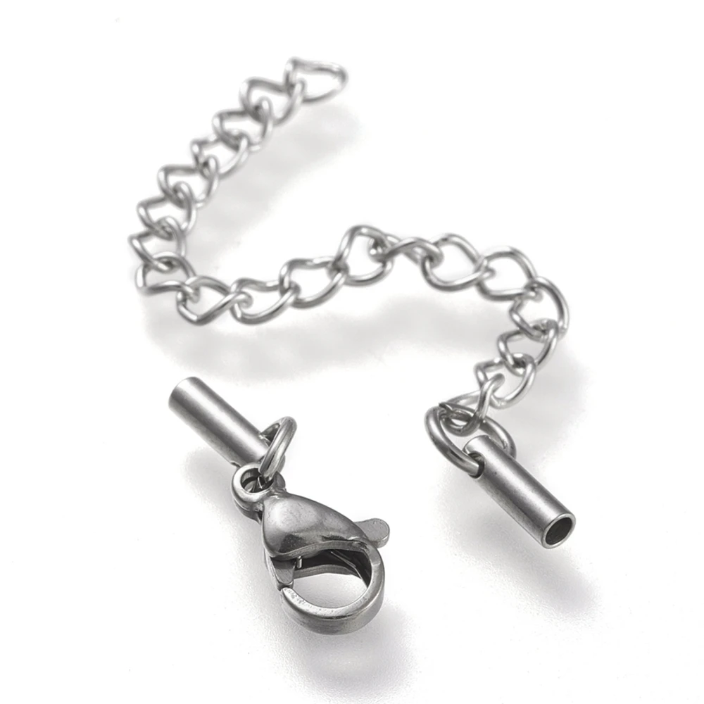 Końcówki do sznurków/rzemieni do wklejania z zapięciem (karabińczykiem) i łańcuszkiem regulacyjnym. Wykonane ze stali nierdzewnej.