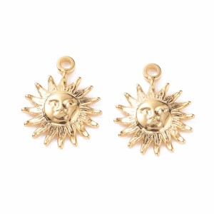 Zawieszka do biżuterii w kształcie słońca, wykonana ze stali nierdzewnej powlekanej bardzo trwałą warstwą koloru w technice galwanizacji próżniowej (PVD). Posiada jedno oczko montażowe, jednostronna. Do ozdobienia biżuterii oraz innych projektów rękodzielniczych.
