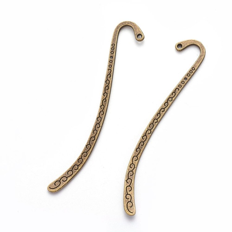 Baza zakładki do książki przeznaczona do zdobienia z grawerowanymi zawiasami. Wykonana z metalu antyalergicznego, stylizowana na mosiądz. Zakładka zakończona jest haczykiem za pomocą, którego można zawiesić ją na krawędziach książki. Wzór na zakładce jest obustronny. Dodatkowo posiada oczko montażowe do którego można doczepić np. zawieszkę lub brelok.