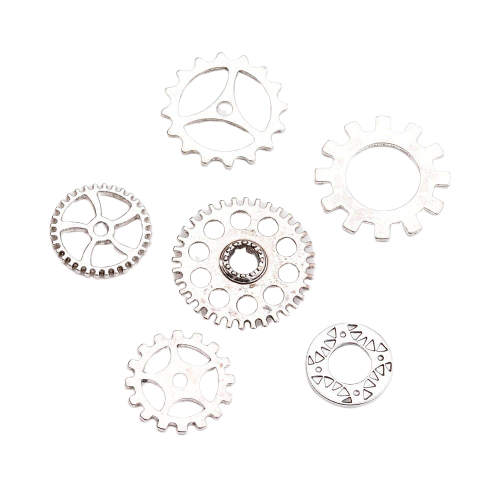 Zestaw elementów biżuteryjnych DIY w kształcie zębatek, tarcz i wskazówek do zegara. Elementy można stosować jako zawieszki, czy łączniki. Półfabrykaty wykonane z metalu w kolorze stare srebro (antyczne srebro).