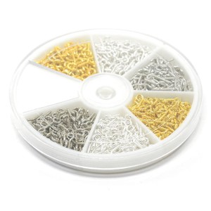 Zestaw szpilek montażowych z wkręcanym gwintem i oczkiem. Półfabrykaty wykonane z metalu biżuteryjnego. Szpilki pozwalają wykonać zawieszki z koralików czy kamieni. Idealnie nadają się do koralików z mas plastycznych, drewnianych i innych miękkich tworzyw, do których można je wkręcić.